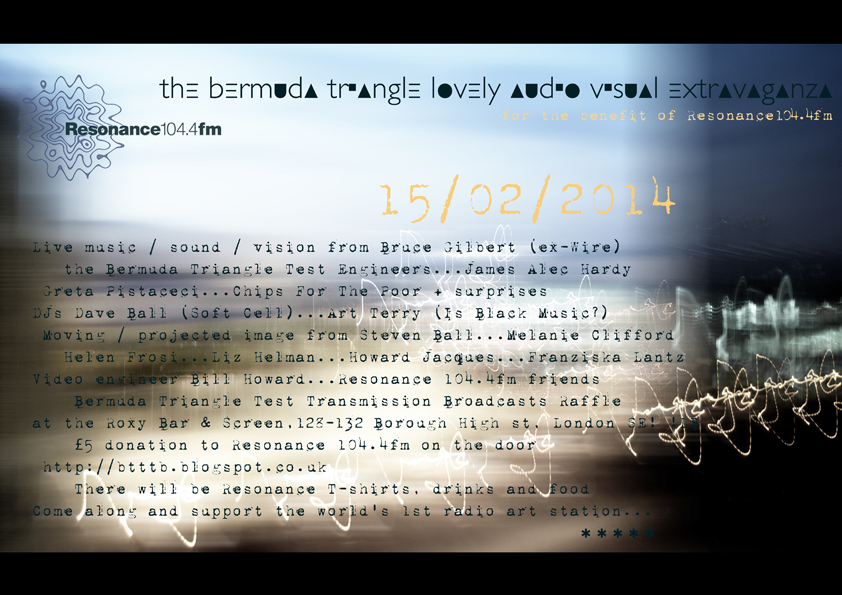 I am really excited to be part of this event hosted by the Bermuda Triangle Test Engineers for ResonanceFM where I will be showing a specially-made video piece to be soundtracked for the first time by BTTB.