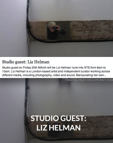 Appearing on sound artist, Graham Dunning’s radio show, Fractal Meat on a Spongy Bone – NTS Radio, London,on Friday morning, 20th March 8-10 + on the day of the eclipse. how very fitting http://ntslive.co.uk/fractal-meat-on-a-spongy-bone-w-liz-helman-20th-march-2015/