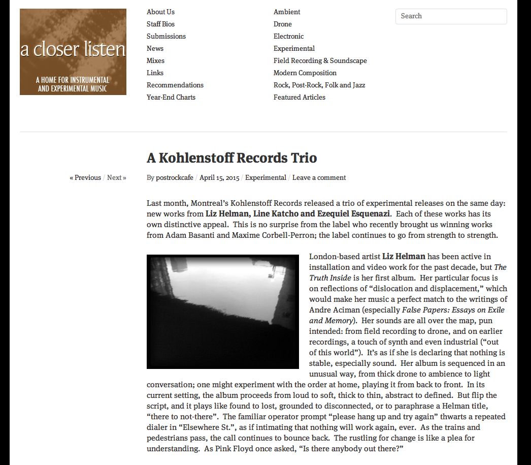 My first album, the truth inside , is released on Montreal based label, Kohlenstoff records. Link + interview here: